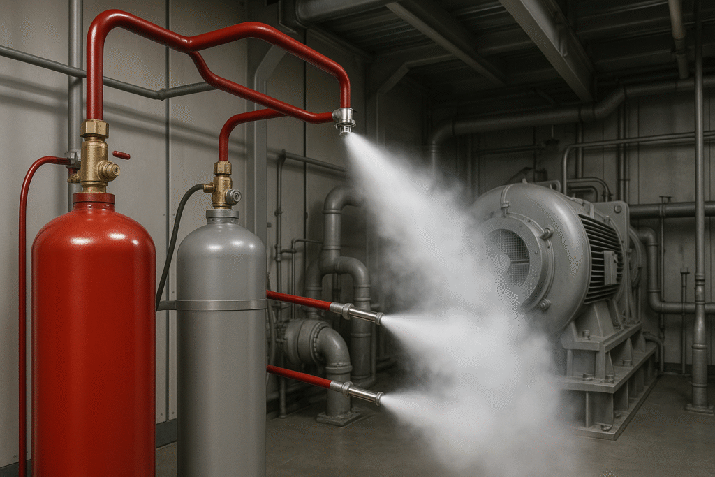 This makes hybrid systems especially effective for enclosed hazards such as turbines, machinery spaces, engine rooms, and data centers. By using both mist and gas, they provide fast flame knockdown, improved cooling, and minimal water damage compared to traditional systems.