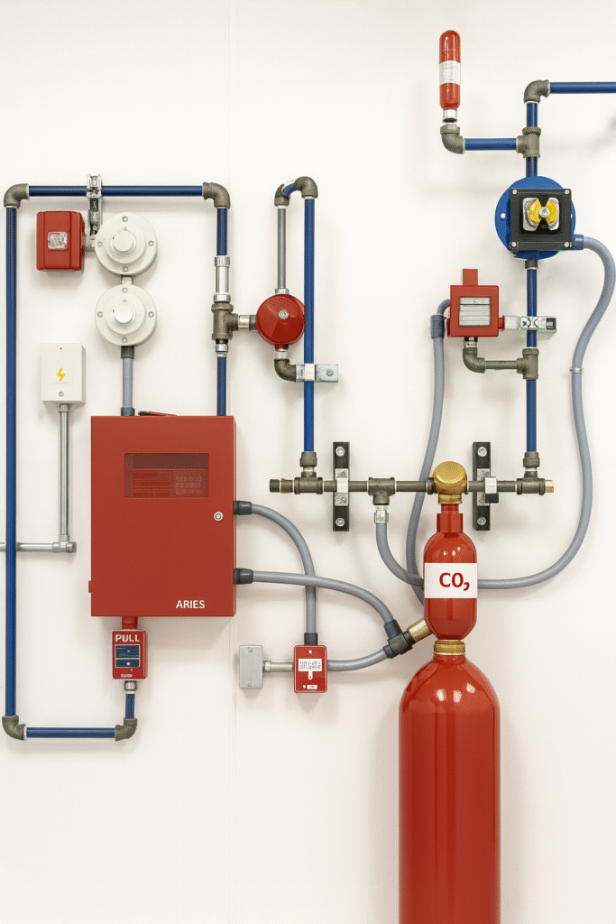A CO₂ suppression system uses carbon dioxide gas to extinguish fires by reducing oxygen levels and cooling the hazard area. The gas is stored in high-pressure cylinders and released through a network of pipes and nozzles, quickly flooding the protected space or targeting specific equipment. Highly effective for flammable liquids, electrical panels, and industrial machinery, CO₂ systems are widely used in power plants, marine vessels, engine rooms, and manufacturing facilities.